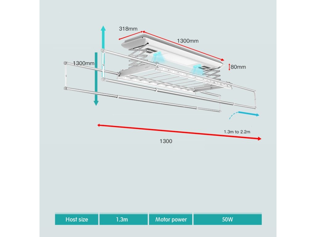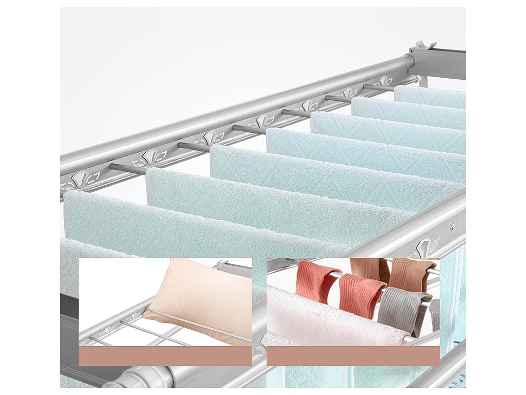 Díky inteligentnímu senzoru se sušák v jakékoliv poloze zastaví, když k němu přiblížíte ruku – bezpečný a přitom plynulý pohyb je základ. Konstrukce z hliníkové letecké slitiny a nosná lana z nerezu GB304 zajišťují stabilitu, odolnost i dlouhou životnost.