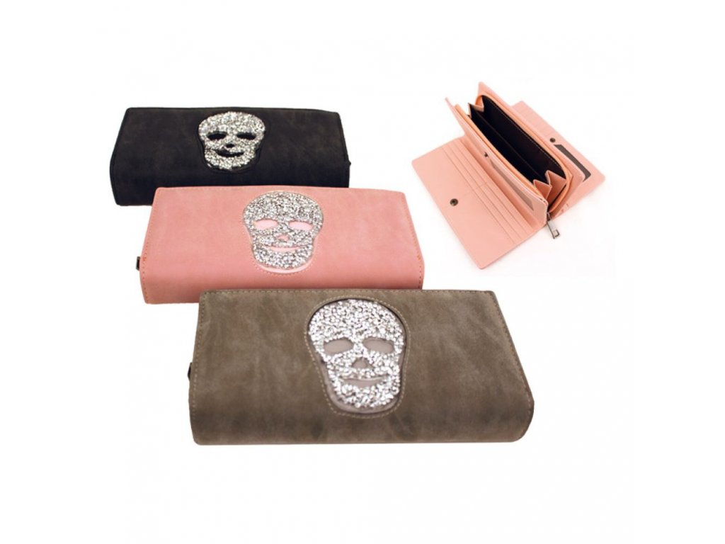 Nejnovější hit - krásná moderní peněženka z příjemného materiálu ekokůže s vykládanými kamínky ve tvaru lebky.